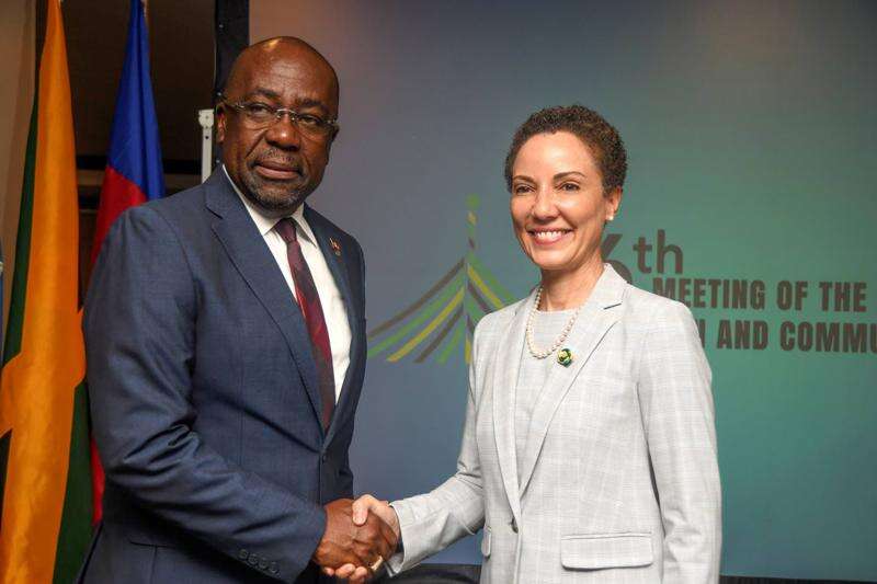 Outgoing chair of the Council for Foreign and Community Relations (COFCOR), Chet Greene, greets new COFCOR chair Jamaica’s Foreign Affairs and Foreign Trade Minister Senator Kamina Johnson Smith at the 26th meeting of COFCOR at the Jamaica Pegasus hotel in St Andrew on Tuesday. Greene is Antigua and Barbuda’s minister of foreign affairs. (Photo: Naphtali Junior)