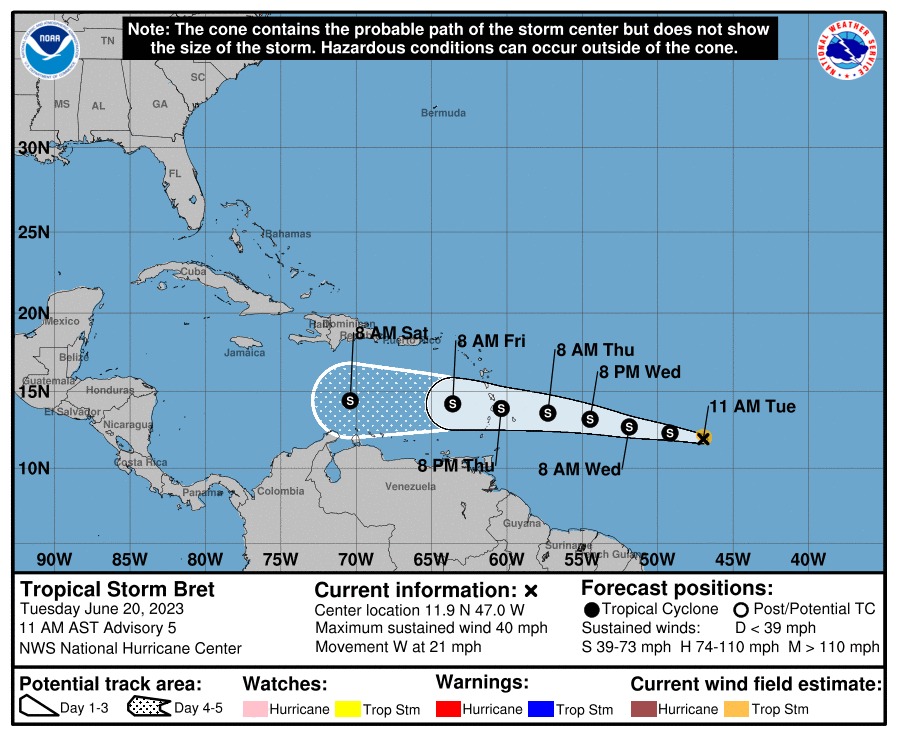 SOURCE: NOAA – Tropical Storm Bret is rapidly approaching Barbados, and portions of the Lesser Antilles are expected to experience heavy rain and strong winds later today and tonight.