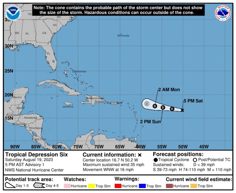 Tropical Depression Six formed about 760 miles east of Antigua and Barbuda