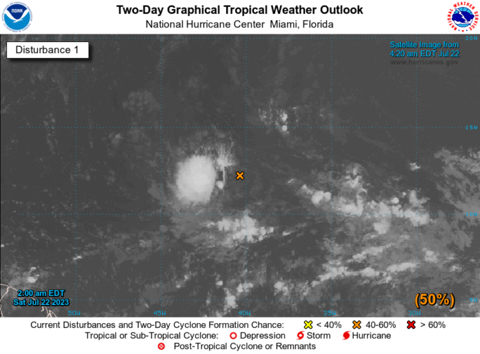 An area of low pressure in the Central Tropical Atlantic now shows a high chance of becoming a tropical depression within the next 48 hours. Environmental conditions are expected to remain conducive for development during the week as it moves westward towards the region.