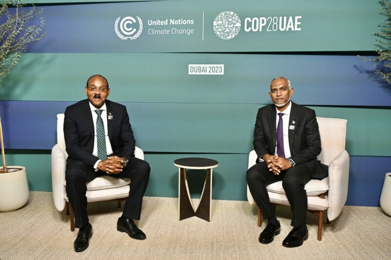 During the ongoing Twenty-Eighth Session of the Conference of the Parties of the United Nations Framework Convention on Climate Change (COP28), President Dr Mohamed Muizzu had the opportunity to meet with Gaston Browne, the Prime Minister of Antigua and Barbuda, in the United Arab Emirates (UAE).