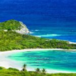 The 132-acre site overlooks a secluded semi-circular beach, adjacent to a protected national park, with cliffs rising into panoramic views over the Caribbean.