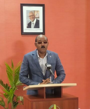 Prime Minister Gaston Browne speaking to reporters at V.C Bird International on his return from China Monday