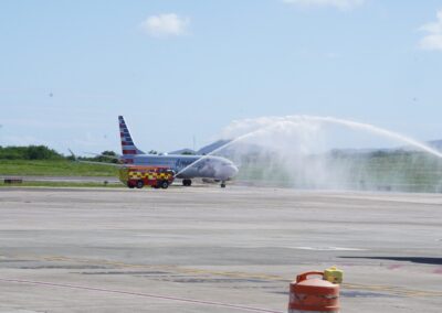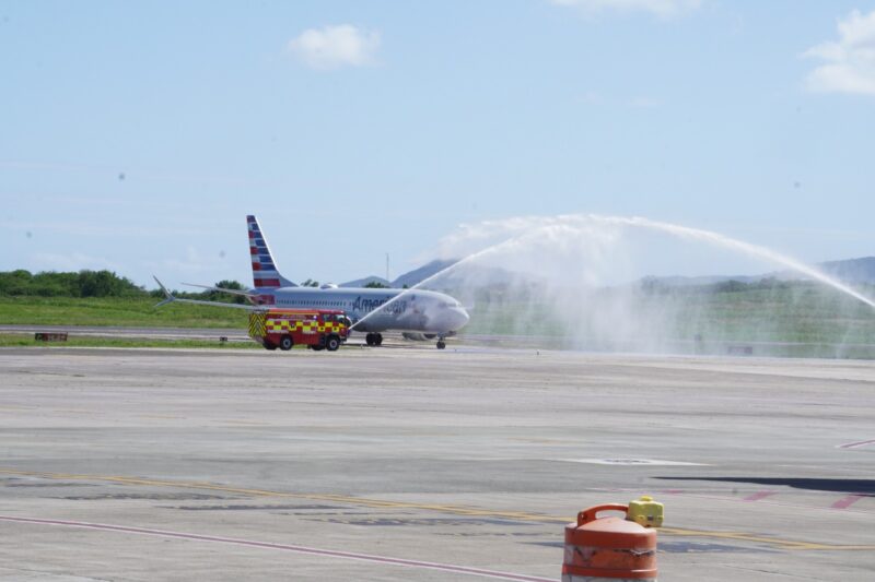 Upon arrival at the gate, Captain Chase was greeted by a group of flag-waving enthusiasts composed of members from the Antigua and Barbuda Tourism Authority, American Airlines, and the media.