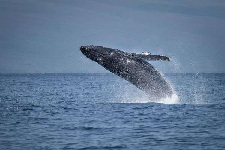 Humpback whales are incredibly distinctive, with their knobbly faces and huge bodies that can grow up to 17-18 metres in length, flanked by long, white pectoral fins which are around a third of their entire body length.