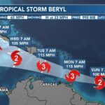 On the forecast track, the center of Beryl is expected to move across the Windward Islands Monday morning and across the southeastern and central Caribbean Sea late Monday through Wednesday.