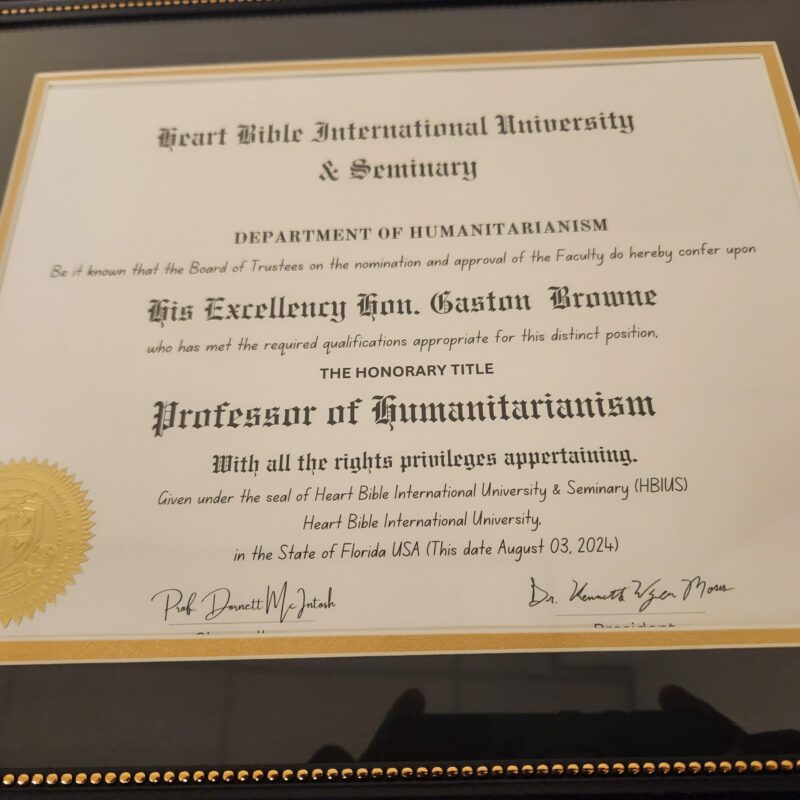 Heart Bible University and Seminary, a historically Black institution based in Connecticut, has honoured Prime Minister Browne with its Presidential Lifetime Achievement Award and as an Honorary professor in Humanitarianism.