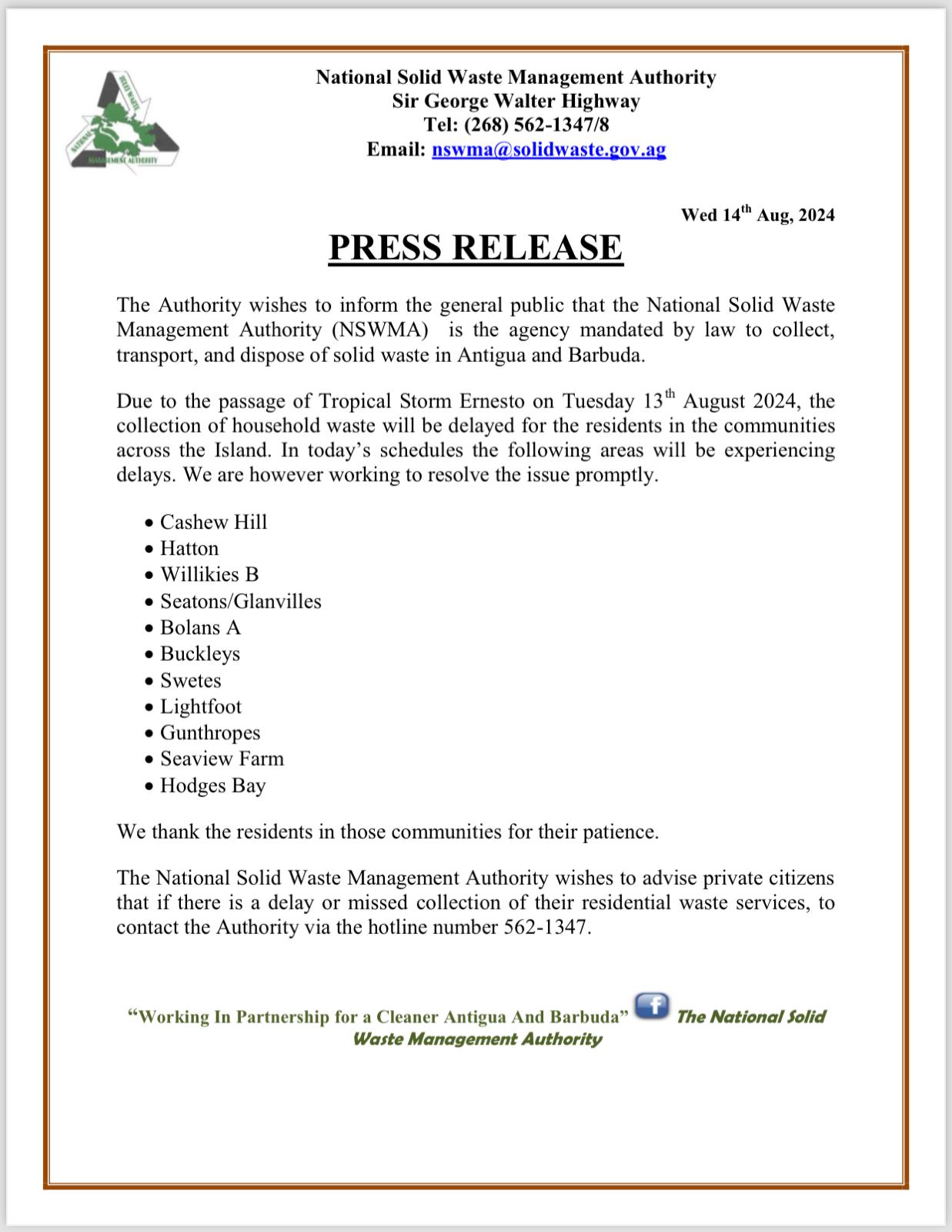 Waste Collection Delayed in Several Communities Due To TS Ernesto