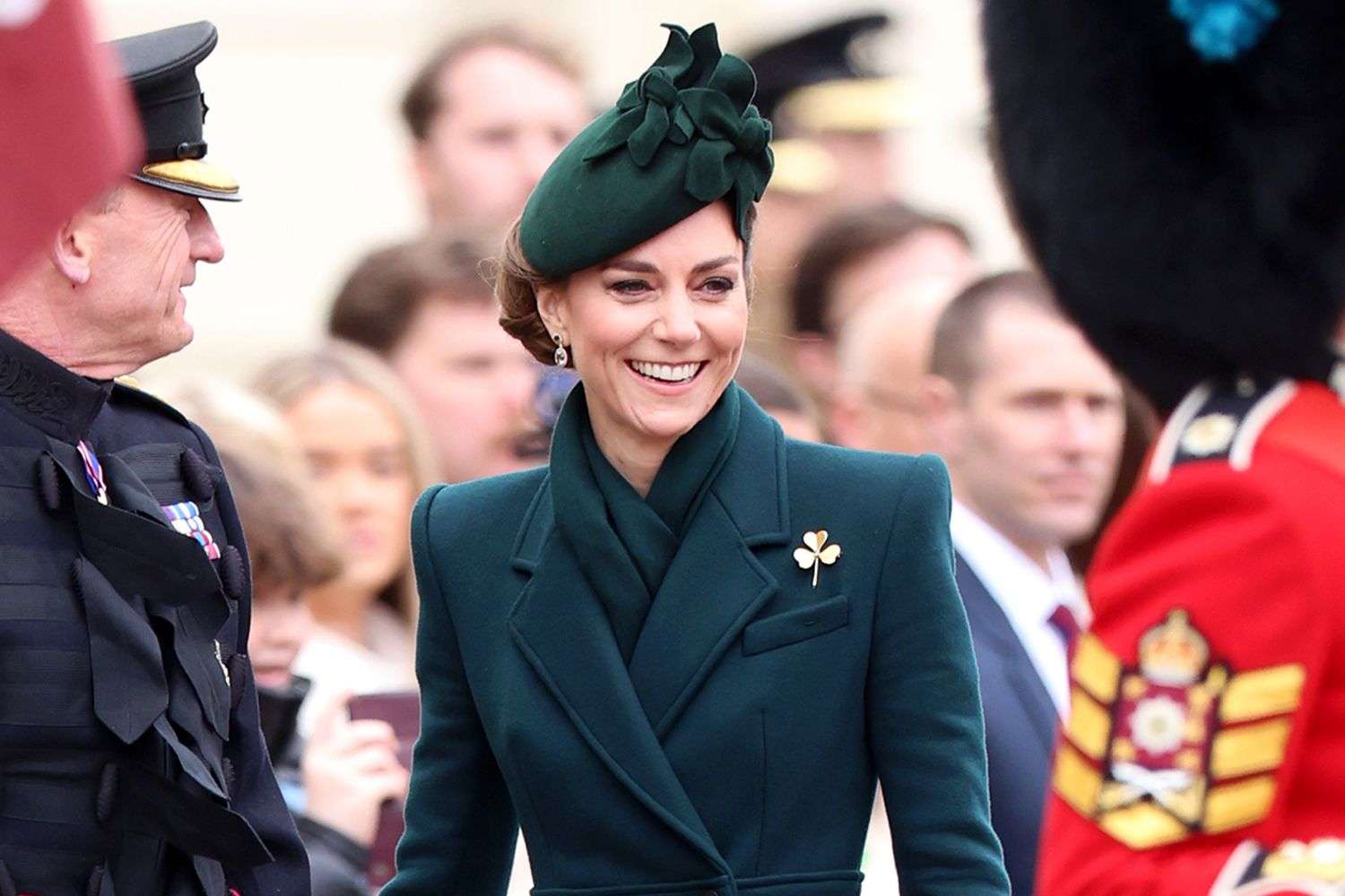 On her first military engagement since completing her chemotherapy treatment, Kate took great pleasure in presenting a shamrock to the Irish Guards’ regimental mascot, Turlough Mor, an Irish wolfhound nicknamed Seamus, who she couldn’t resist giving a warm pat.