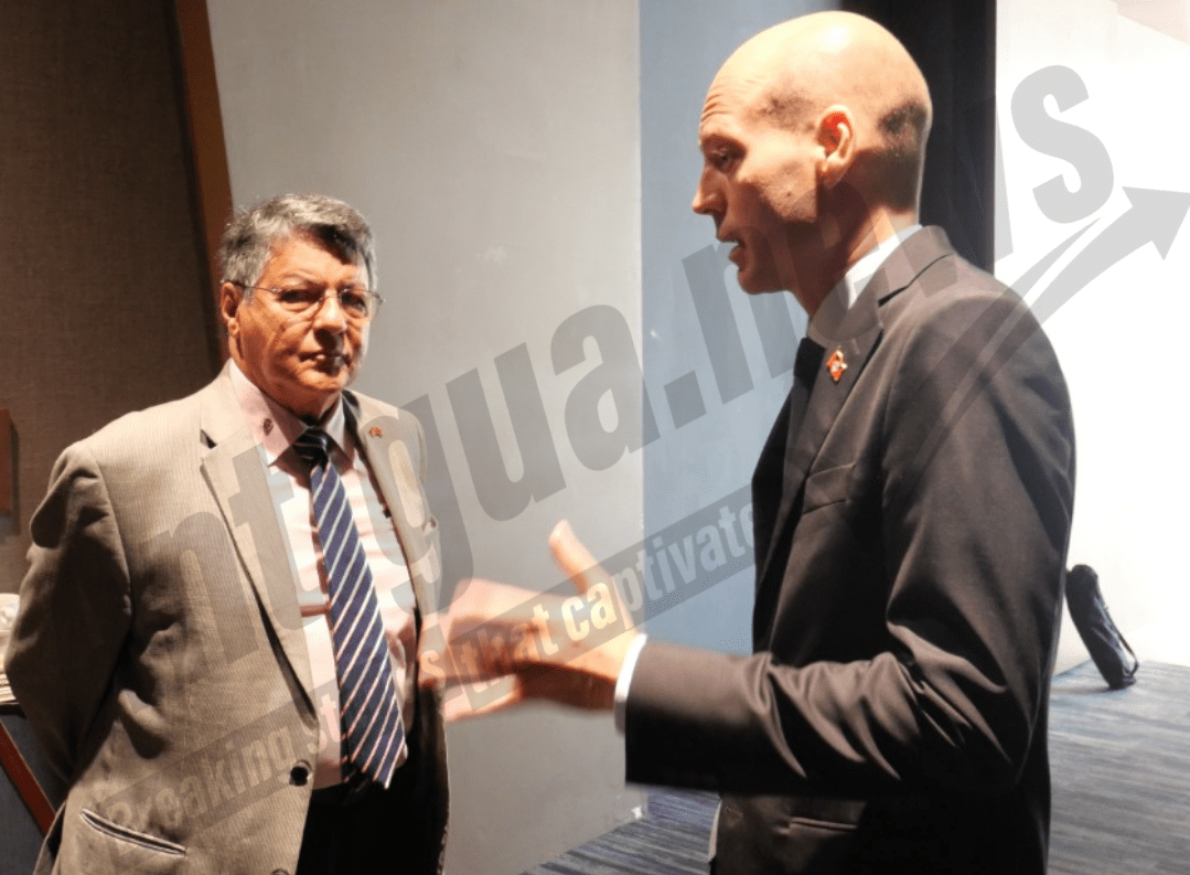 Brian Stuart-Young (left) Speaks With Colleague at Just Concluded Ambassador Forum in Antigua. (Photo by Luigi Rodriguez)
