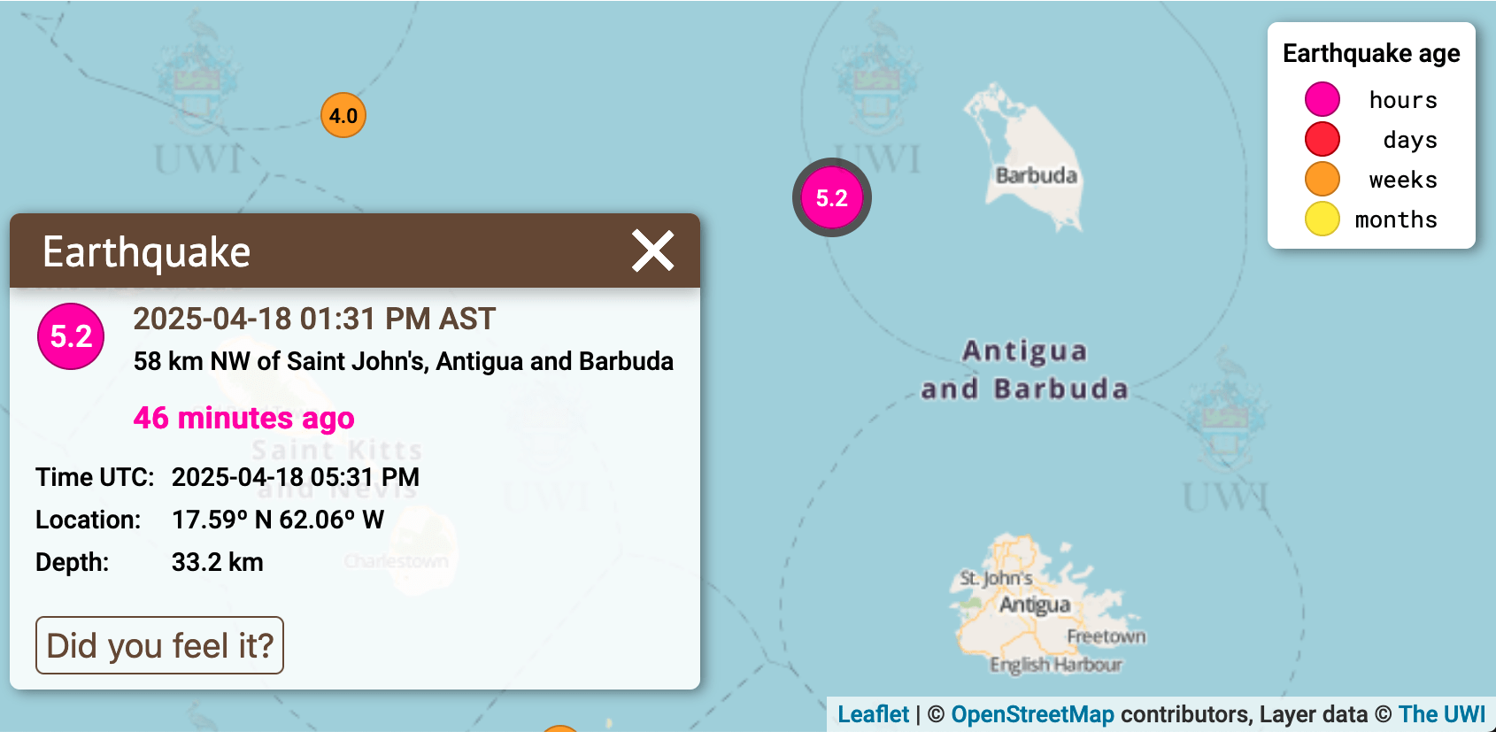 A 5.2 Magnitude Earth was recorded near Antigua and Barbuda (UWI Seismic Research Center)