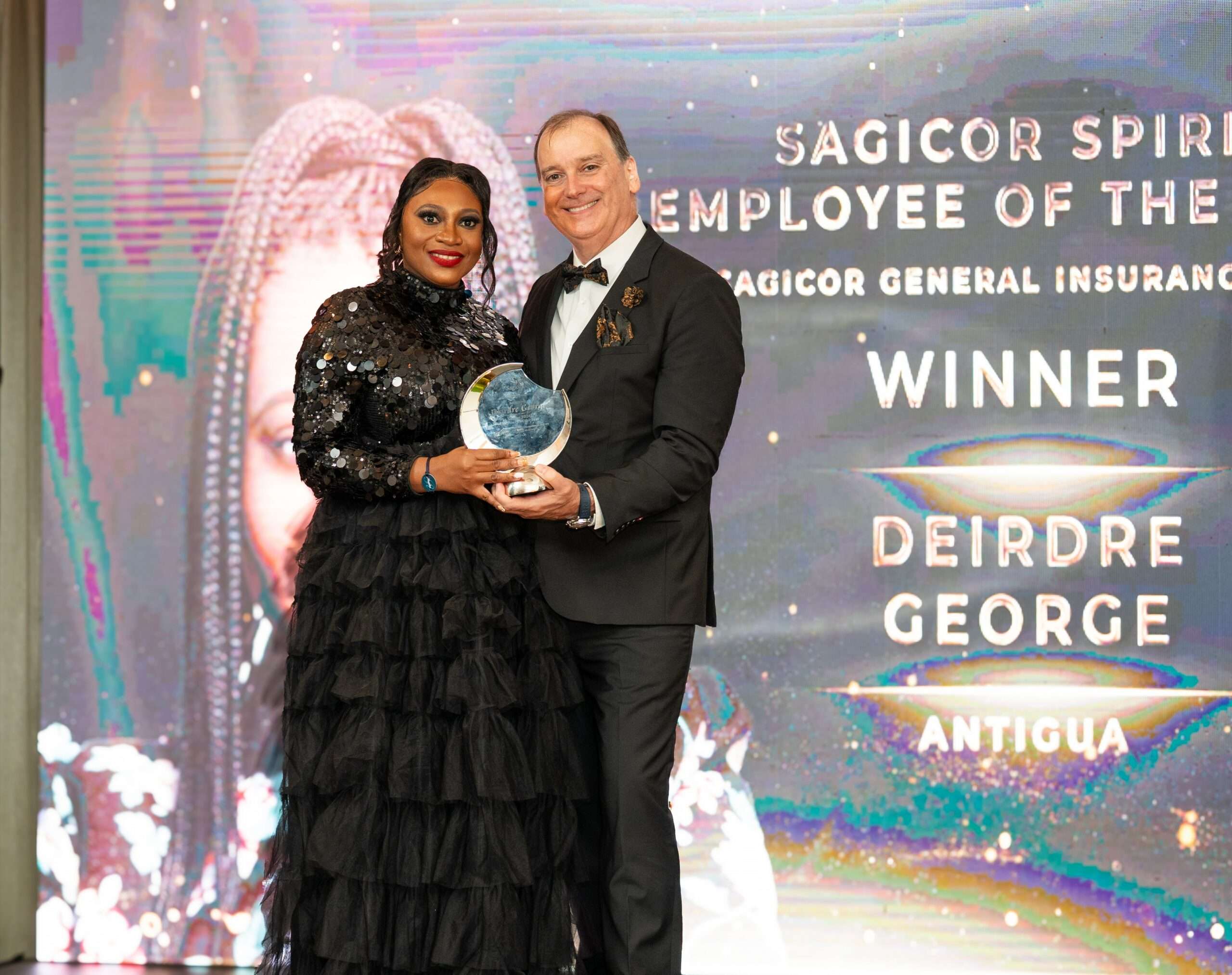 Dierdre George, Senior Underwriter with the Antigua Branch of Sagicor General Insurance took home Contributor of the Year and Employee of the Year for SGI at Sagicor’s Annual Awards for the Eastern Caribbean and Belize. Here she is presented with her Employee of the Year Award by Robert Trestrail, President and CEO for Sagicor Life Inc.