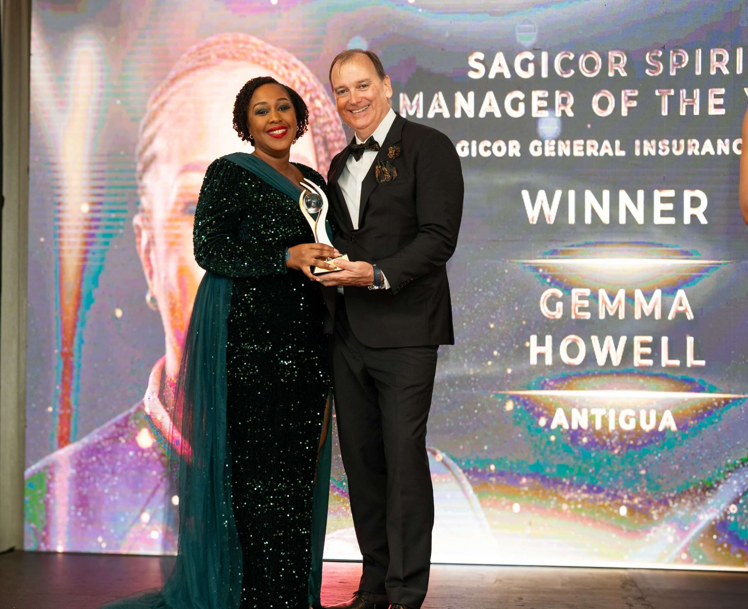 Here, Gemmal Howell, Manager at the Antigua Branch for Sagicor General Insurance accepts her award for Manager of the Year from Robert Trestrail, President and CEO for Sagicor Life Inc.