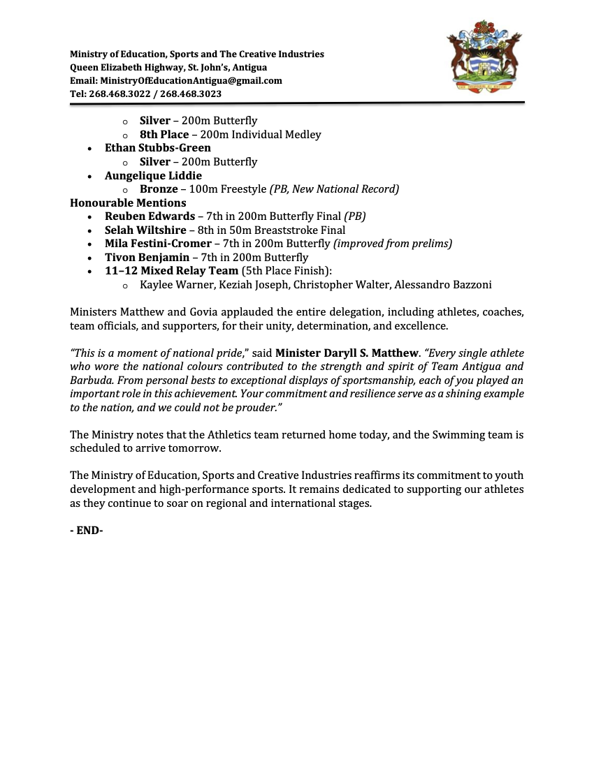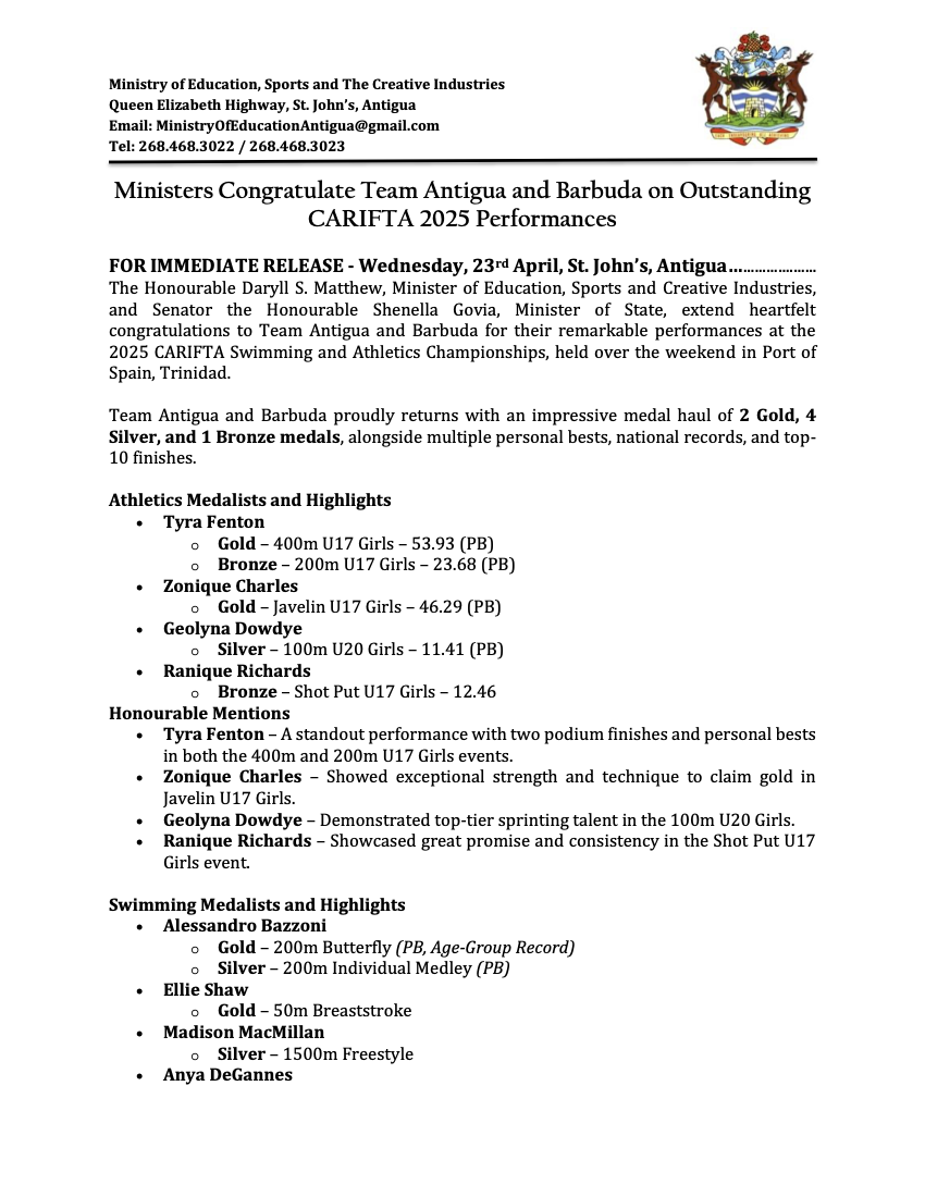 Ministers Congratulate Team Antigua and Barbuda on Outstanding CARIFTA 2025 Performances