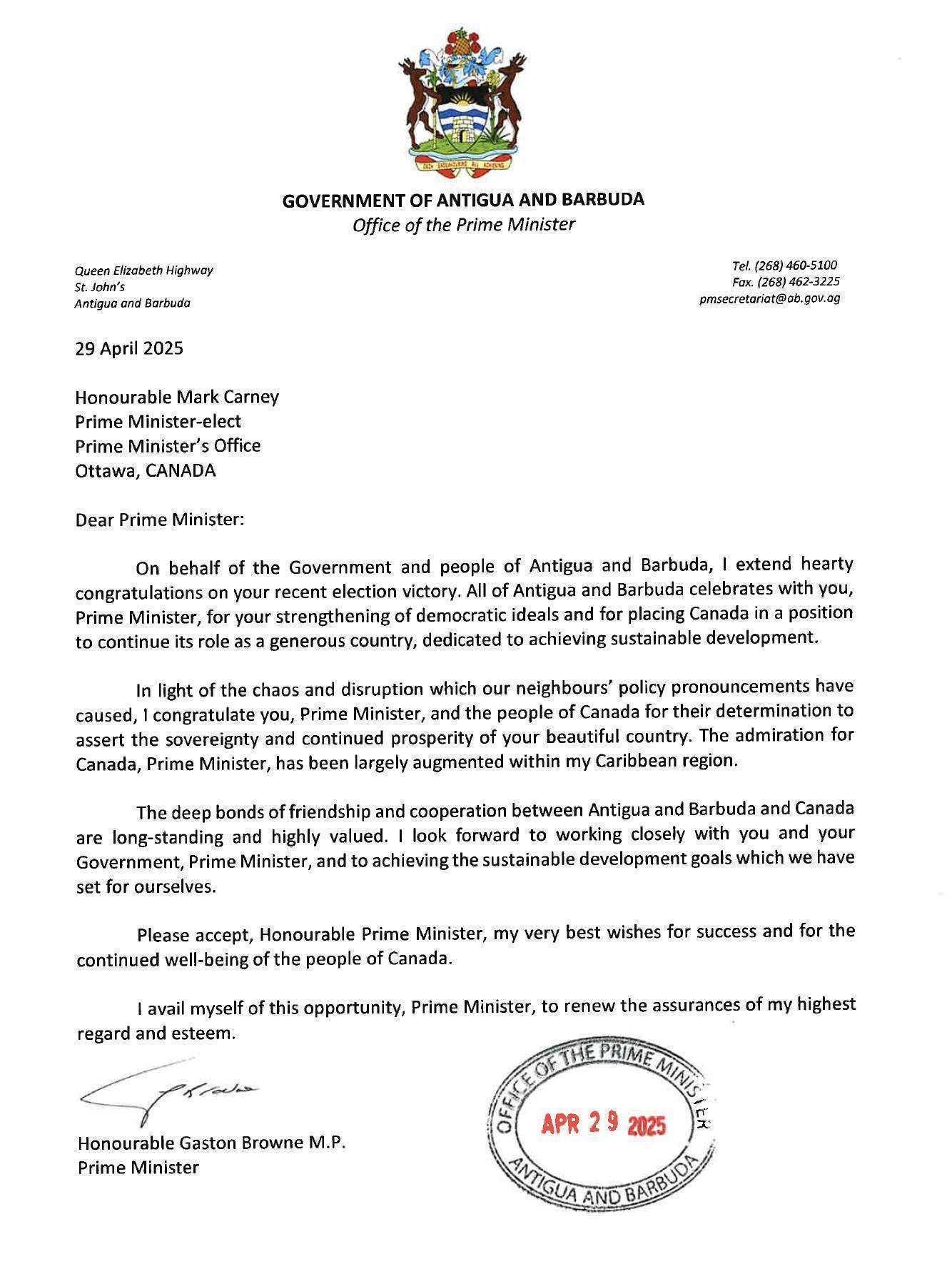 On behalf of the Government and people of Antigua and Barbuda, I extend hearty congratulations on your recent election victory. Al of Antigua and Barbuda celebrates with you, Prime Minister, for your strengthening of democratic ideals and for placing Canada in a position to continue its role as a generous country, dedicated to achieving sustainable development.