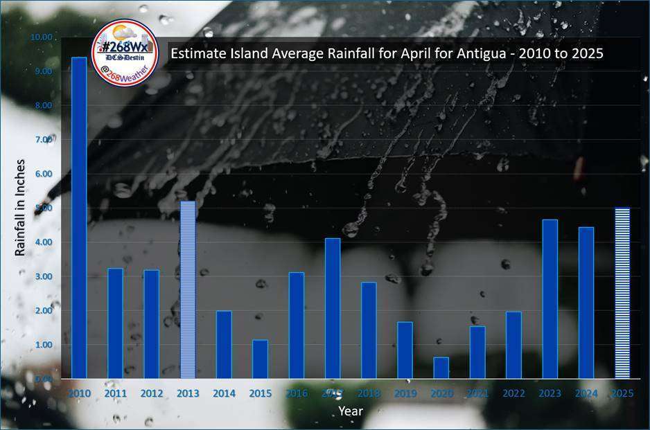 The wet April capped off a generally damp start to the month and 2025. For the year to date (January through April), Antigua has accumulated rainfall amounts that place it as the 10th wettest January-April period on record, and the wettest since 2010.