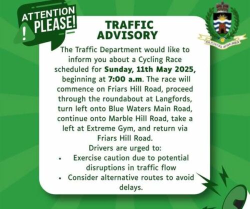 The race will commence on Friars Hill Road, proceed through the roundabout at Langfords, turn left onto Blue Waters Main Road, continue onto Marble Hill Road, take a left at Extreme Gym, and return via Friars Hill Road.