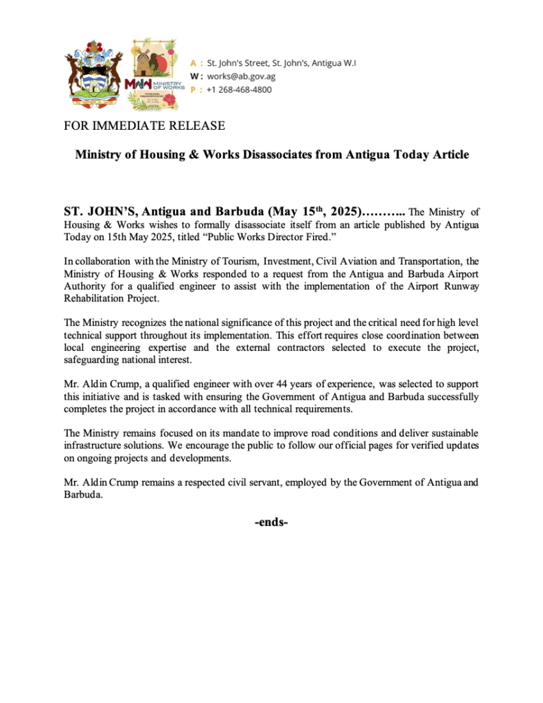 The Ministy of Public Works has officially responded to an article on Antigua.news and other news outlets claiming that their director Aldin Crump was dismissed.