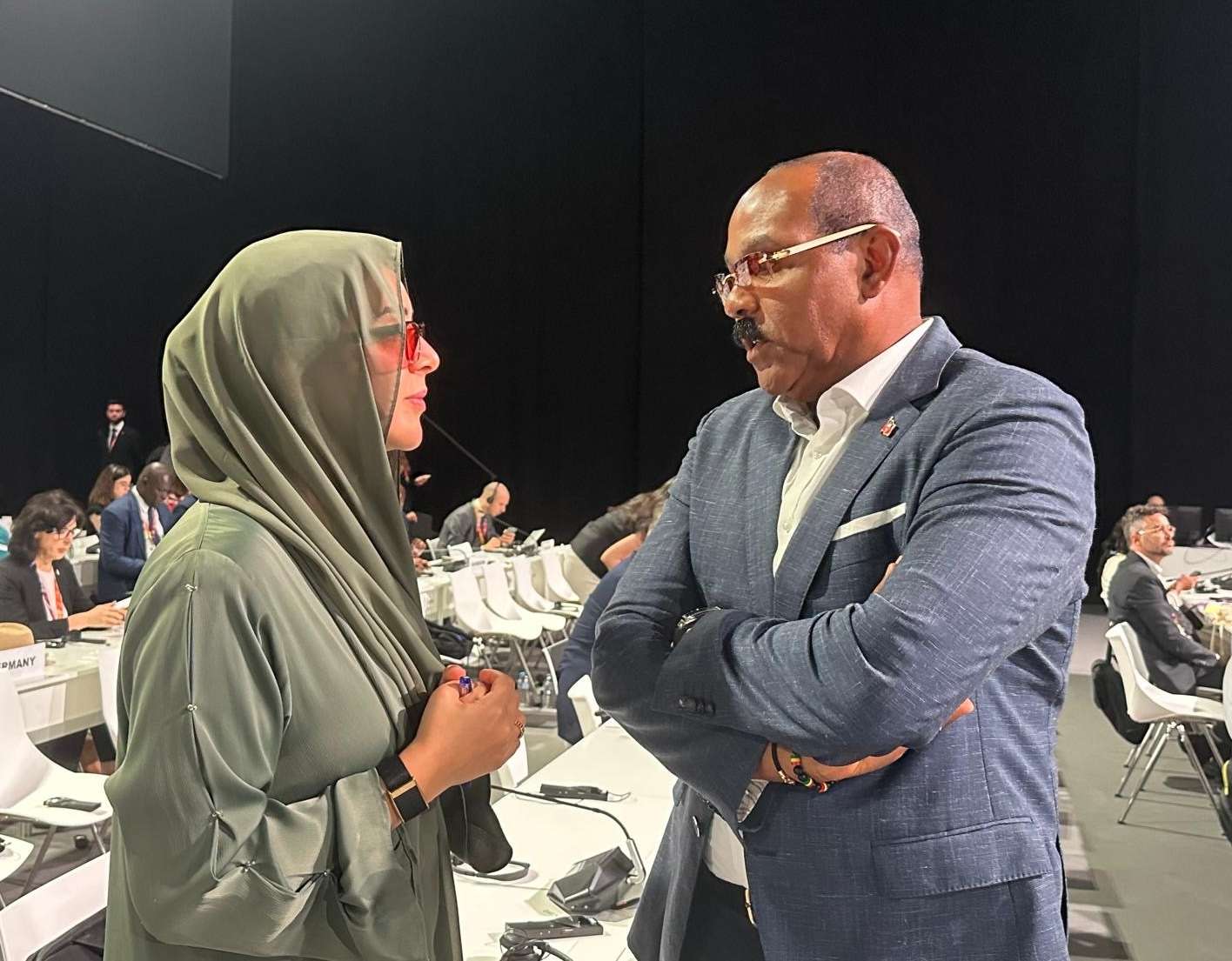 Prime Minister Gaston Browne in discussion with Minister of State for International Cooperation for the UAE, Her Excellency Reem Bint Ebrahim Al Hashimy on the margins of the Conference (Office of the Prime Minister)