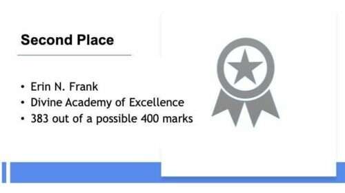 Erin Frank of Divine Academy of Excellence was second with 383 and there was a tie for third with Marciyah Henry of Baptist Academy of Antigua and Liya Marca-Goodwin of Post Millennial Academy scoring 378.