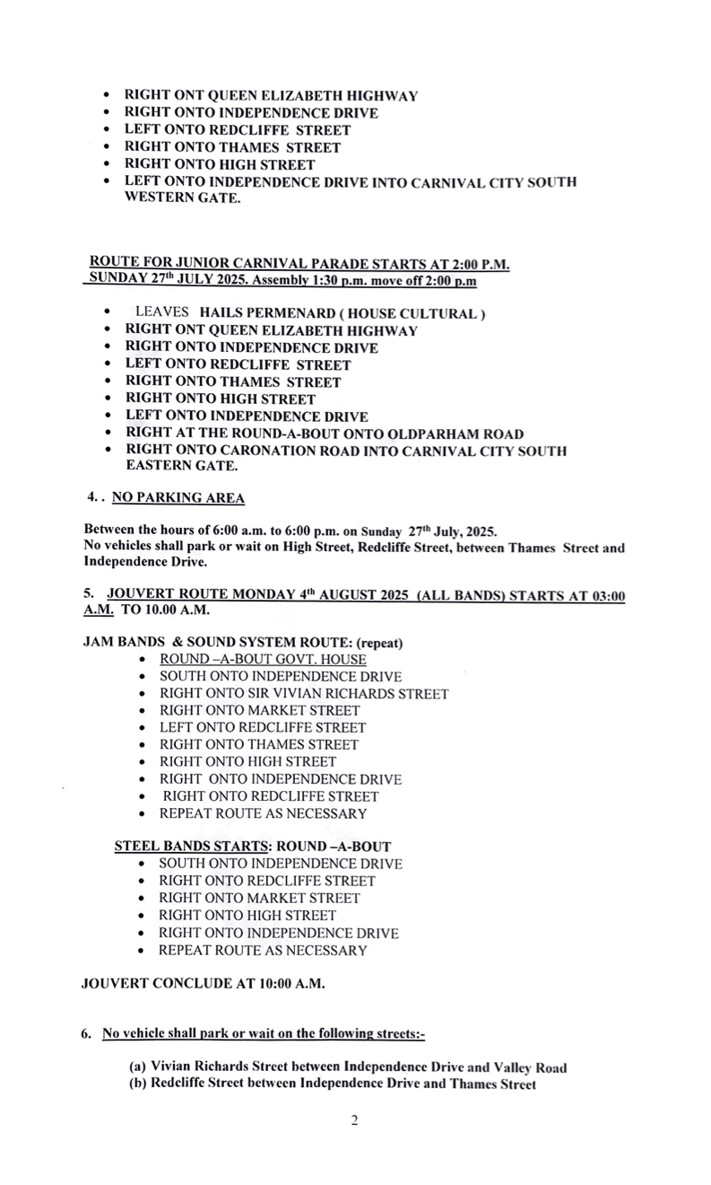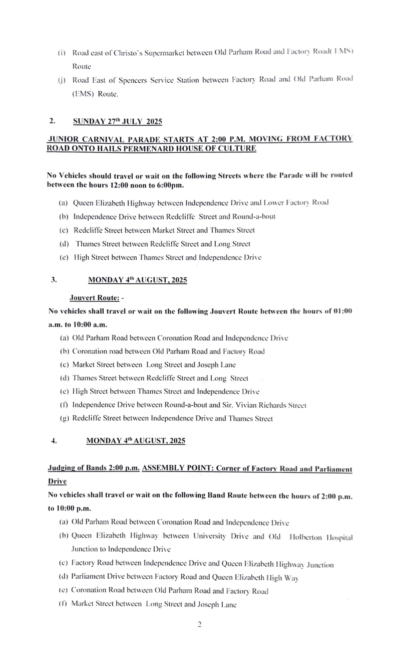 The plan outlines a series of temporary road closures, diversions, and traffic changes aimed at reducing congestion, ensuring public safety, and supporting the smooth staging of major events such as T-shirt Mas, Junior and Senior Parades, J’Ouvert, and Last Lap.