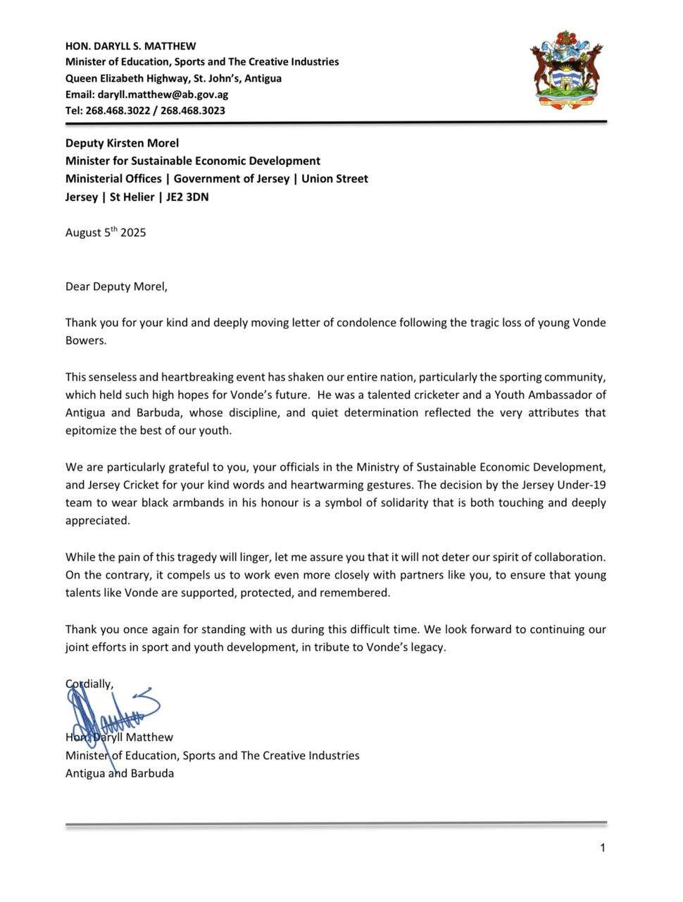 In a letter addressed to the Minister of Education, Sports, and Creative Industries, Daryll Matthew, Jersey’s Minister for Sustainable Economic Development, Deputy Kirsten Morel, extended condolences on behalf of his government and officials within Jersey’s cricket and economic development circles.