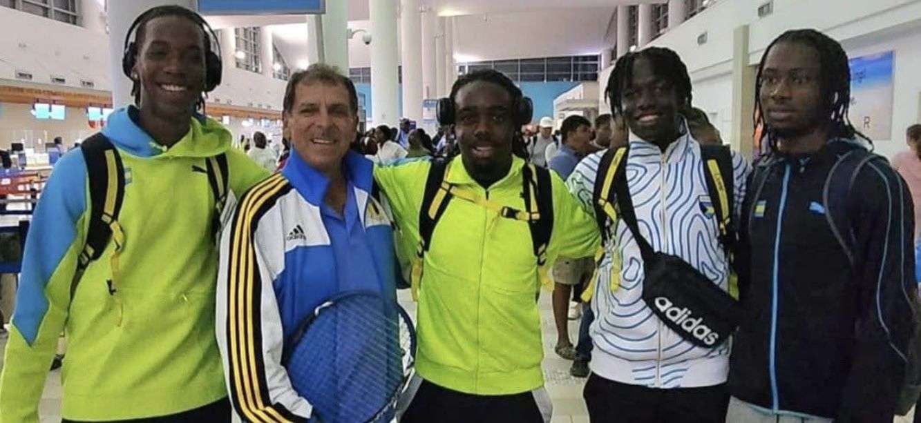 The Bahamas defeated Antigua & Barbuda, 3-0, at the Davis Cup Americas Group IV Tournament at the National Racquet Sports Centre in Tacarigua, Trinidad & Tobago, on Tuesday. From left are team member Michael Major Jr., Team Captain John Antonas, and team members Denali Nottage, Donte Armbrister and Kofi Bowe (Photo Credit: The Nassau Guardian)