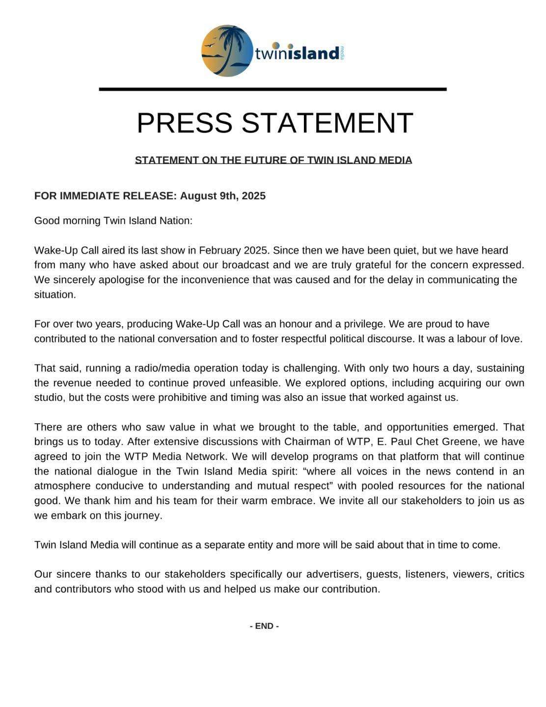 STATEMENT ON THE FUTURE OF TWIN ISLAND MEDIA