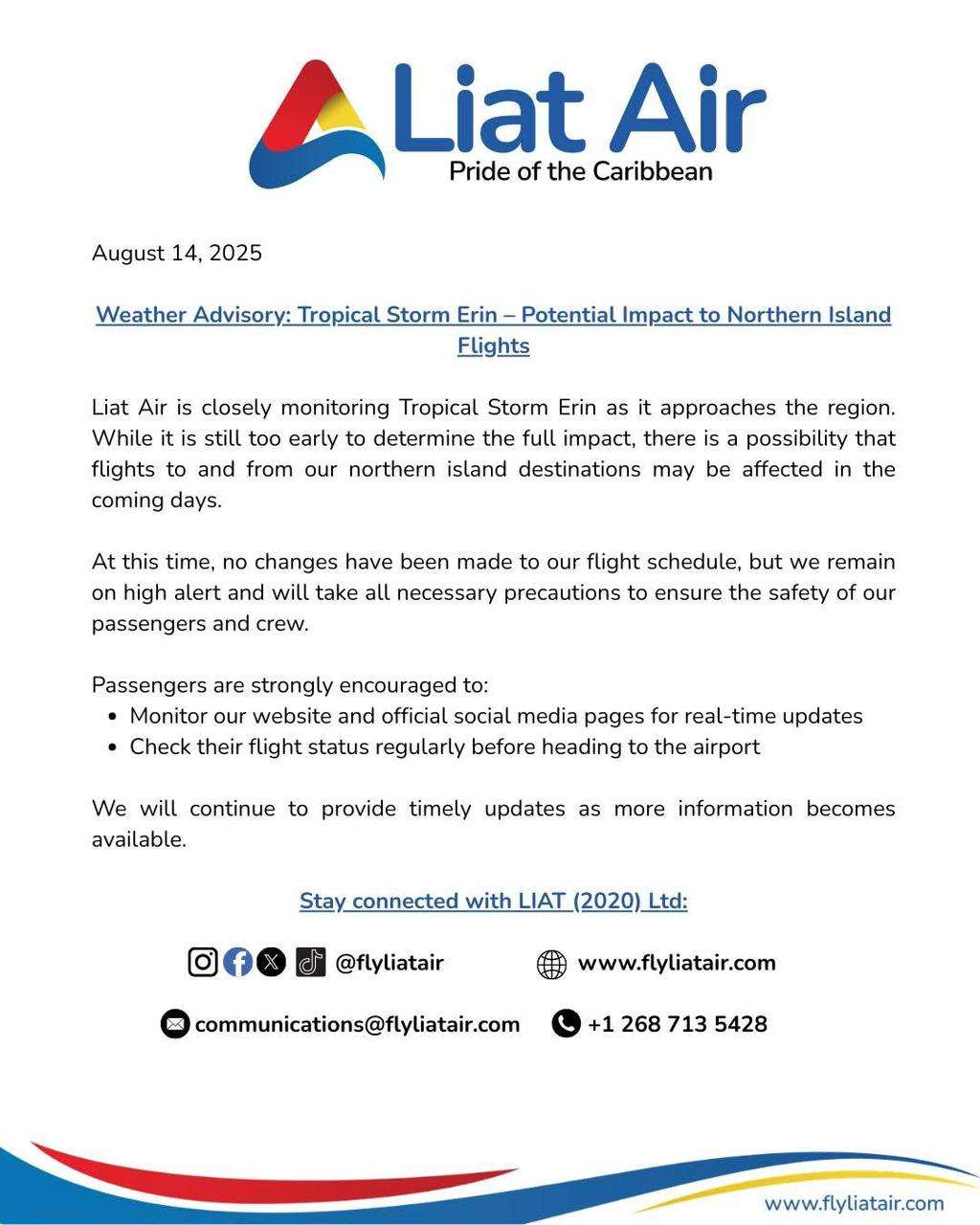 Regional carrier Liat Air is keeping a close eye on Tropical Storm Erin as it tracks toward the northern Caribbean, cautioning that flights to and from its northern island destinations may face disruptions in the coming days.