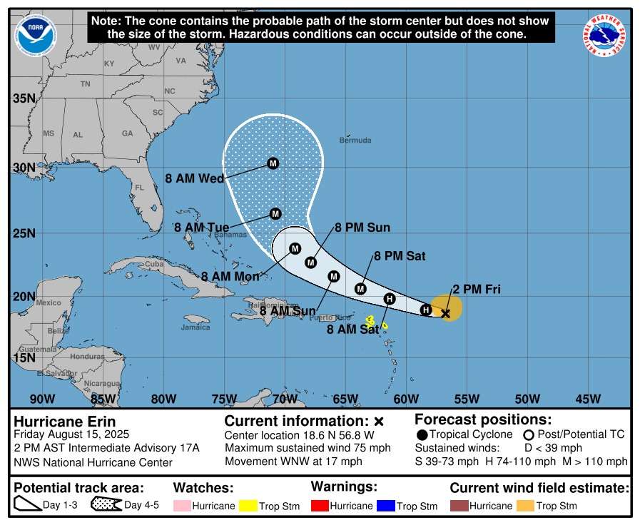 At 2 p.m. AST, the storm’s centre was positioned about 330 miles east-northeast of Barbuda, with sustained winds holding steady at 75 mph. Erin is moving west-northwest at 17 mph, according to the National Hurricane Center.