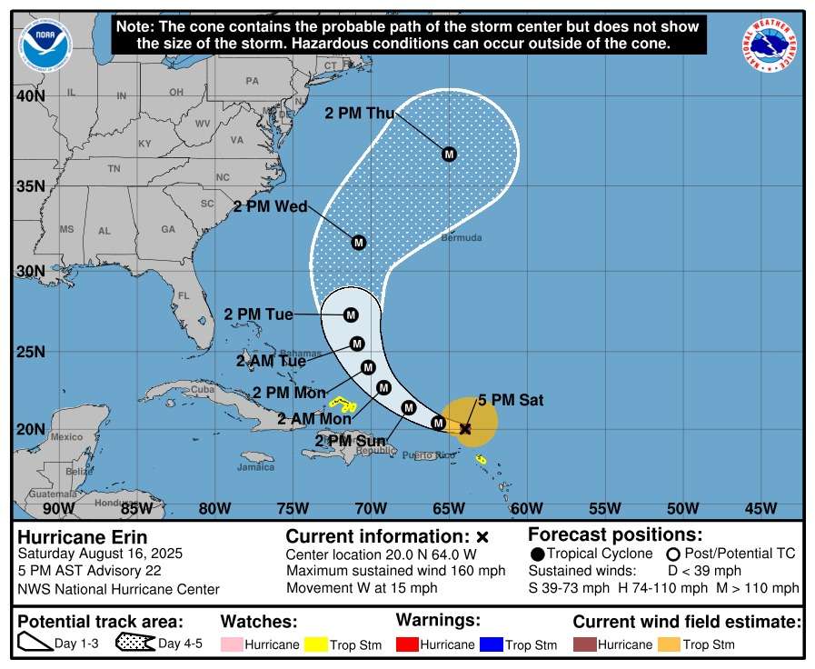 The National Hurricane Center (NHC) said Erin is packing maximum sustained winds of 160 mph (260 km/h), with its eye located about 135 miles north-northwest of Anguilla at 5 p.m. AST. The storm is moving west at 15 mph but is expected to slow down and gradually turn north in the coming days.
