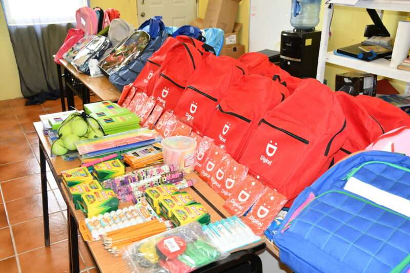 Cross section of backpacks and school supplies gifted to students in Barbuda at the Holy Trinity Primary School.