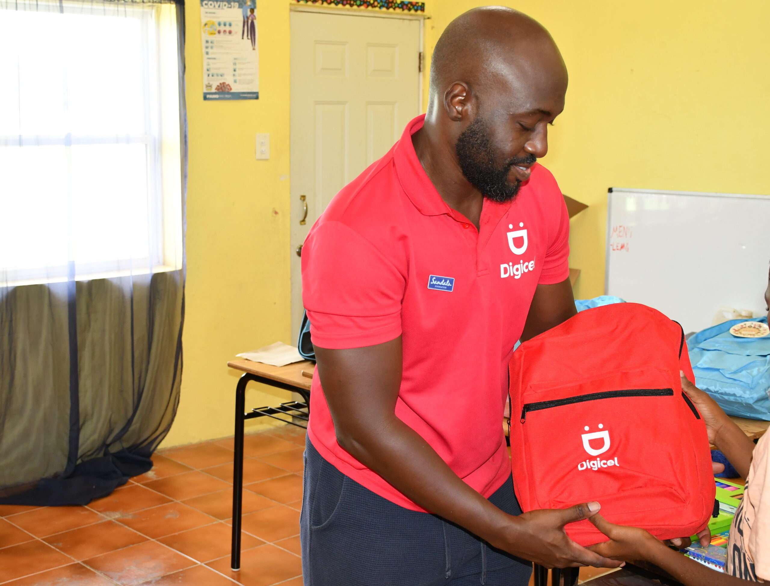 Digicel Antigua Commercial Manager Ikenley Francis gifting a Digicel branded backbag with school supplies to student in Barbuda.