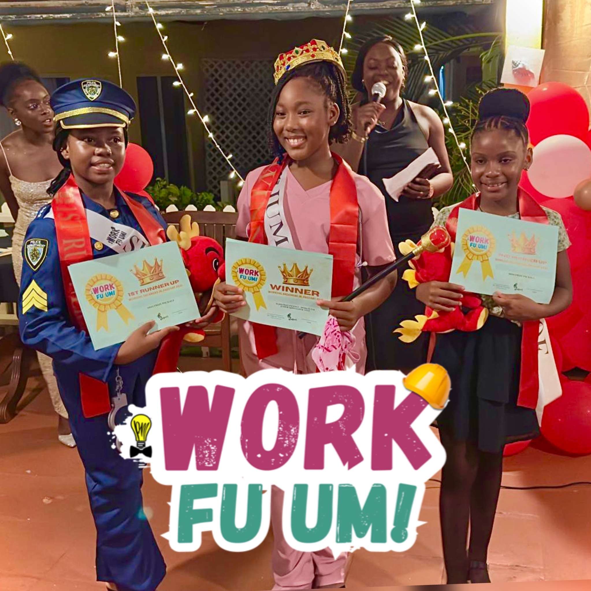 Jarvis topped a field of eight delegates to claim the title, with 11-year-old Shedi-Anne Edwards named First Runner-Up and appointed Deputy Ambassador, and 8-year-old Khloe Desilver placing Second Runner-Up, earning the role of Assistant Ambassador. The trio now make up the initiative’s Ambassador Circle, serving as the youthful representatives of the Work fu um program.