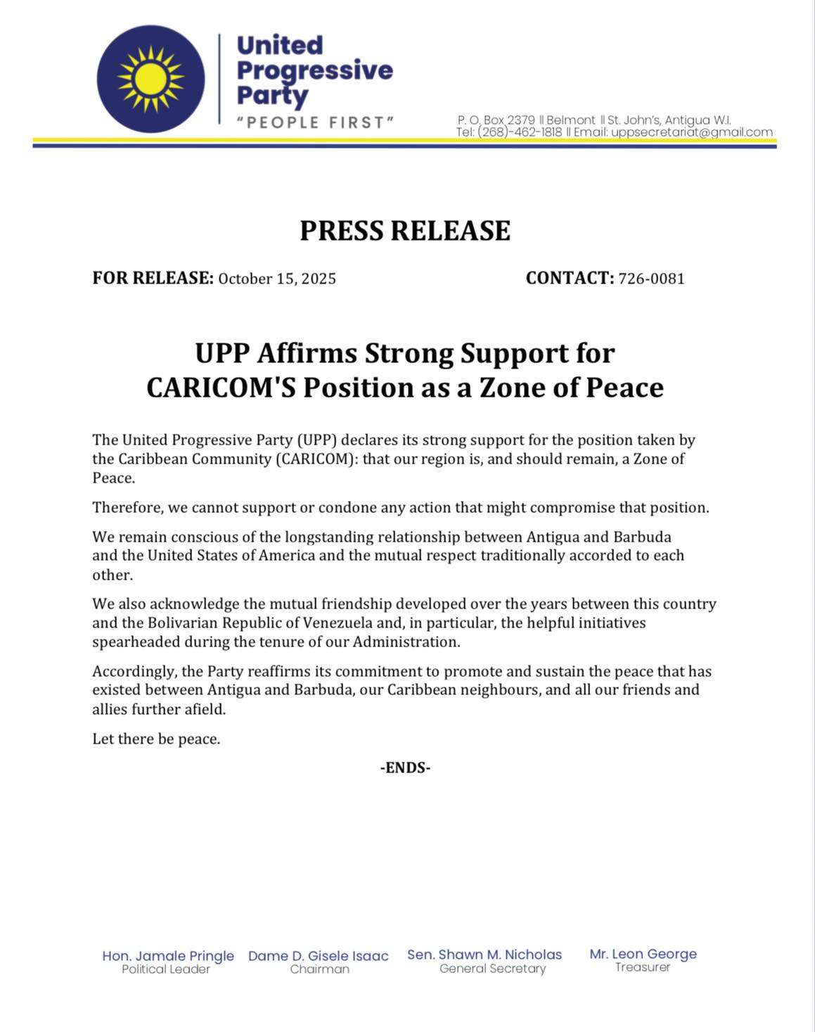 The United Progressive Party (UPP) has expressed firm support for the Caribbean Community’s (CARICOM) long-standing stance that the Caribbean region must remain a Zone of Peace, emphasizing the importance of diplomacy and non-aggression in regional and international affairs.