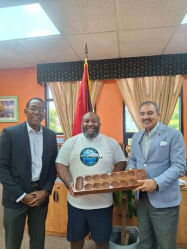 During a courtesy visit, Minister Fernandez presented Mr. Sims with a hand-crafted Wari board, symbolizing friendship, collaboration, and gratitude for his group’s generosity and positive engagement during their visit to Antigua and Barbuda.
