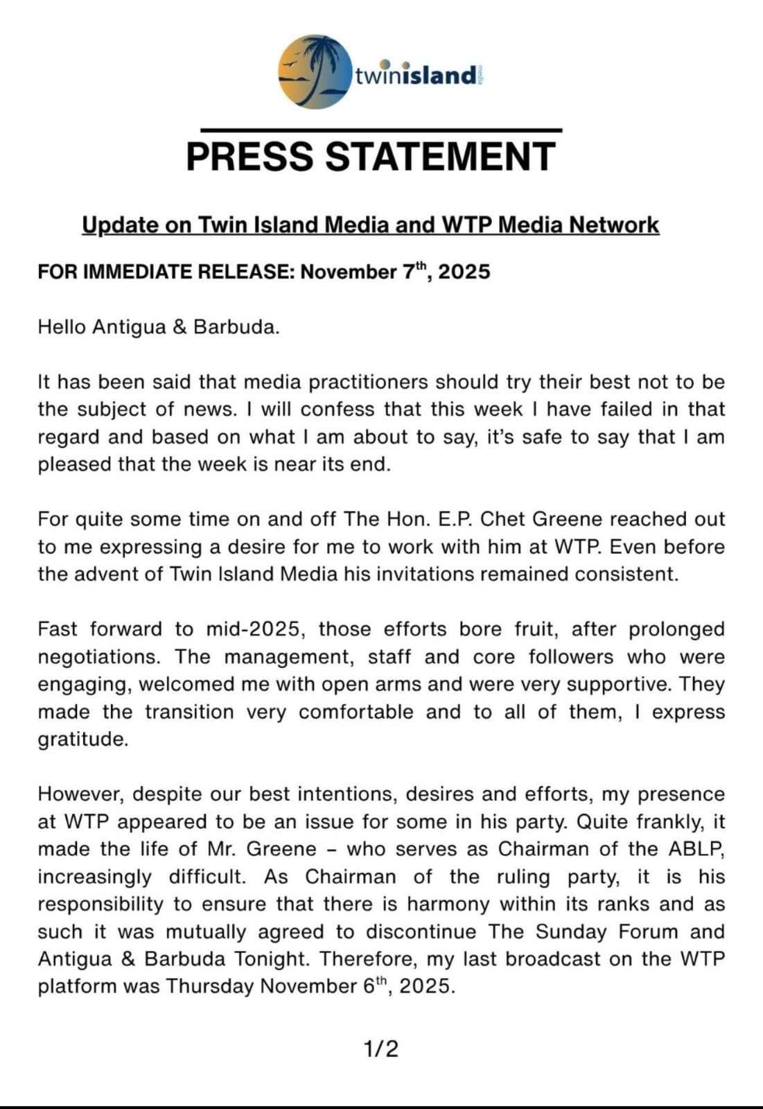 In a detailed resignation letter released last night, Matthew-Ward confirmed that his final broadcast on the WTP platform took place on Thursday, November 6, 2025. He explained that the decision to discontinue his programmes was mutually agreed upon, following discussions with Foreign Affairs Minister and ABLP Chairman, Hon. E.P. Chet Greene.