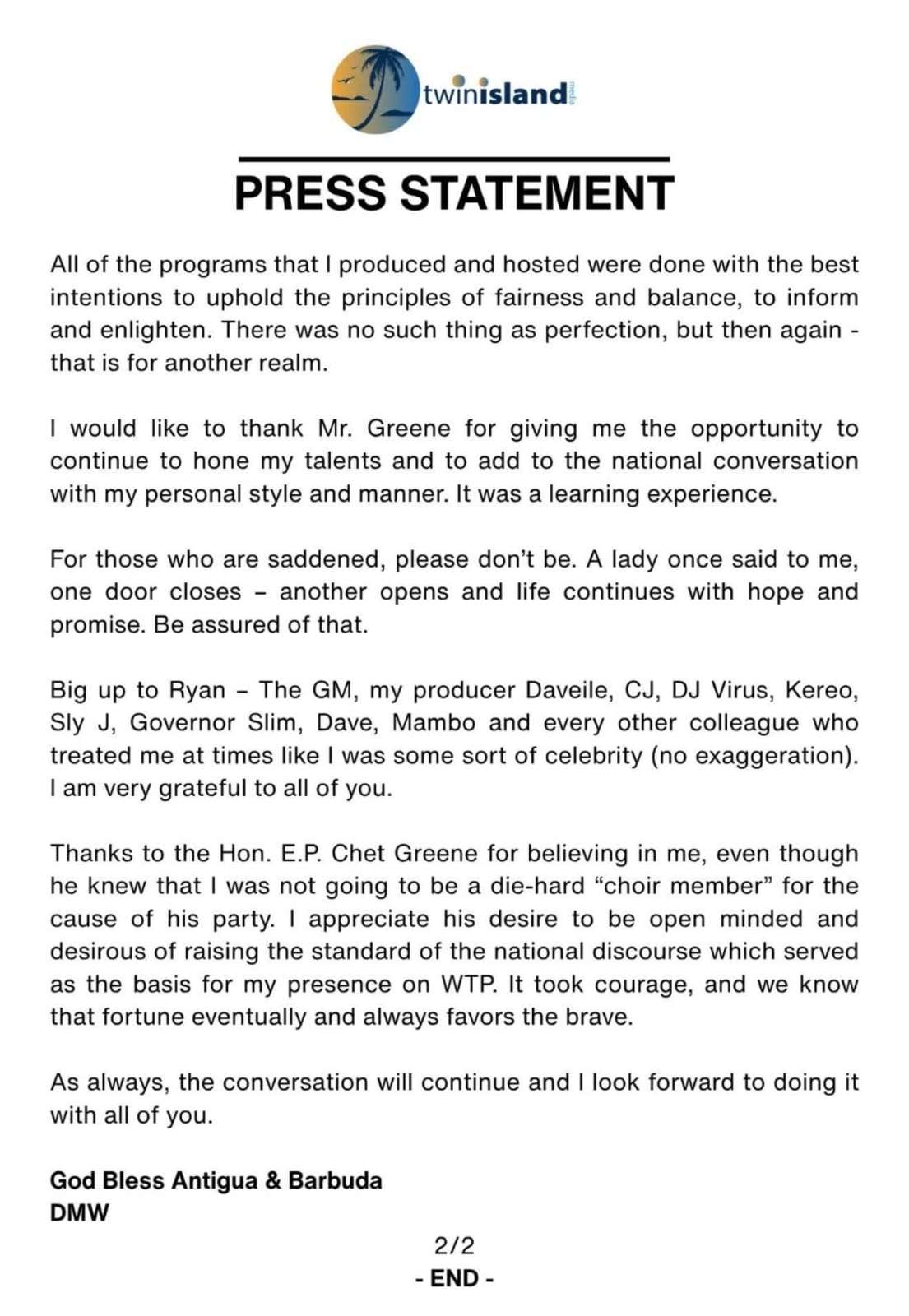 Matthew-Ward said that despite the best efforts of all parties, his presence at WTP “appeared to be an issue for some” within the ruling Antigua and Barbuda Labour Party, which in turn made Minister Greene’s position as party chairman “increasingly difficult.”
