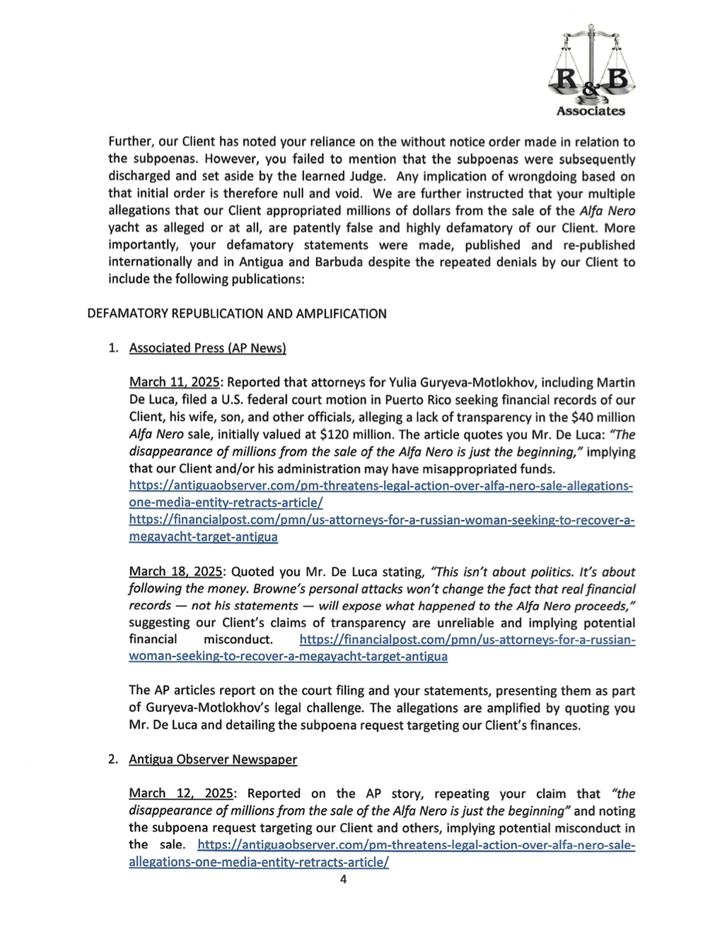 Prime Minister Gaston Browne has formally initiated legal proceedings in reaction to new allegations concerning the sale of the luxury superyacht Alfa Nero.