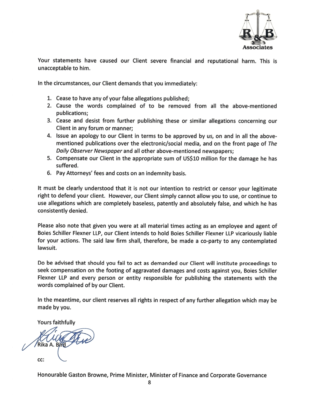 In a statement released on Tuesday night, Browne announced that his U.S. attorney is set to send a pre-action letter within 48 hours to the American law firm Boies Schiller Flexner, headed by attorney David Boies, requesting $10 million in damages for alleged defamation.