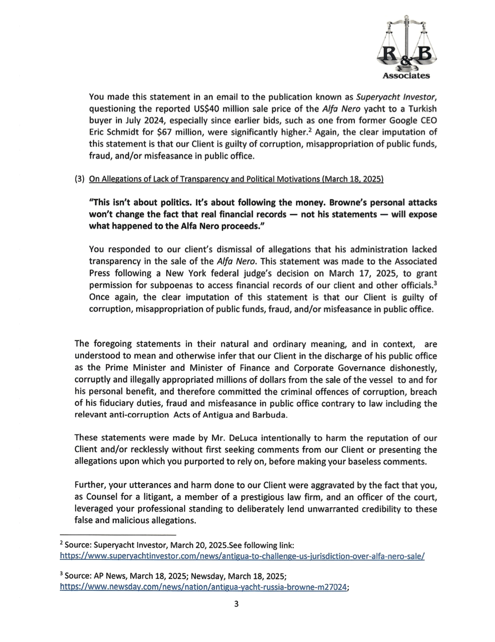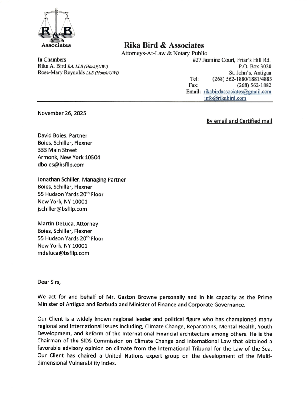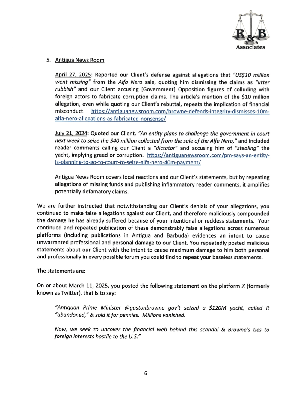 Prime Minister Gaston Browne has formally initiated legal proceedings in reaction to new allegations concerning the sale of the luxury superyacht Alfa Nero.