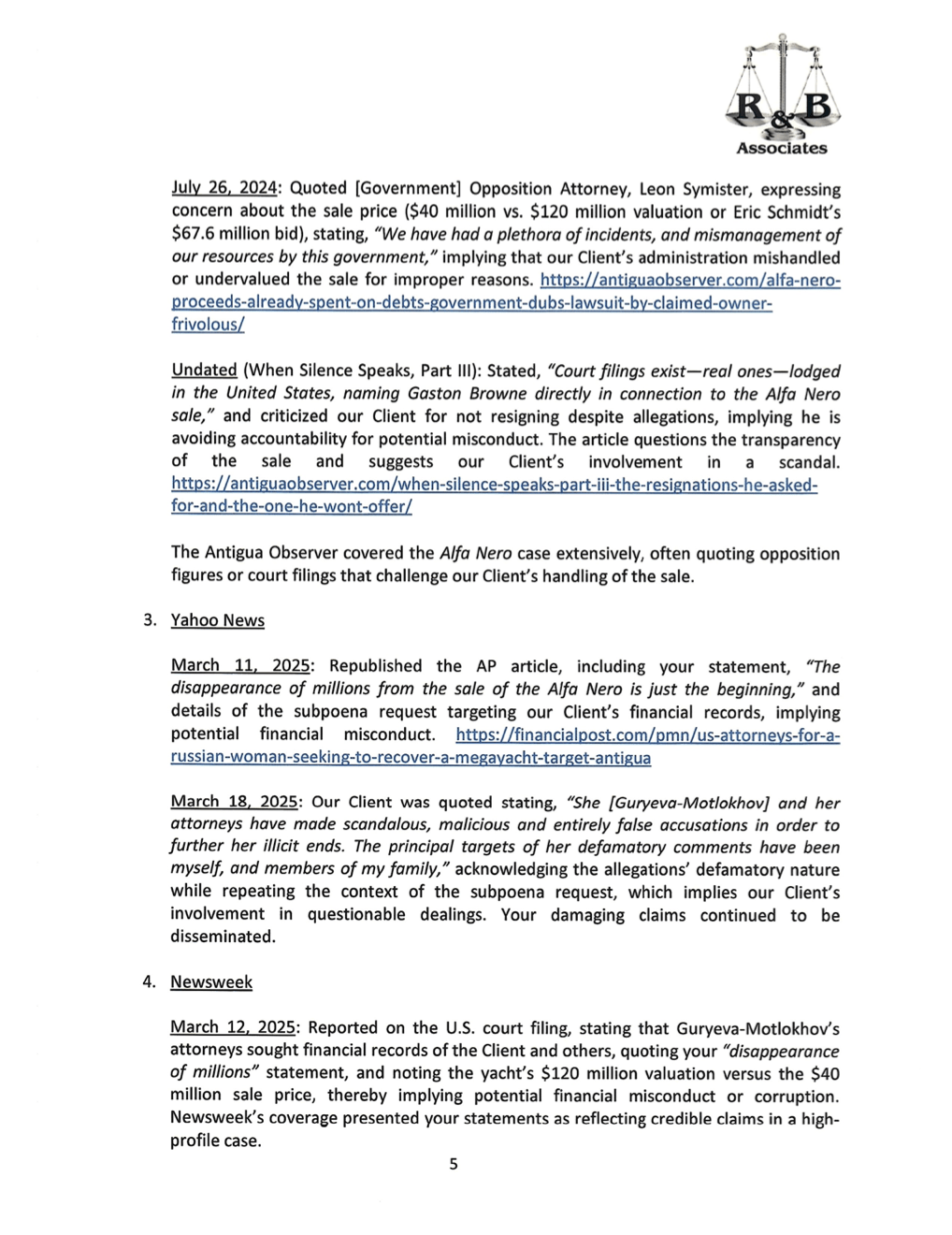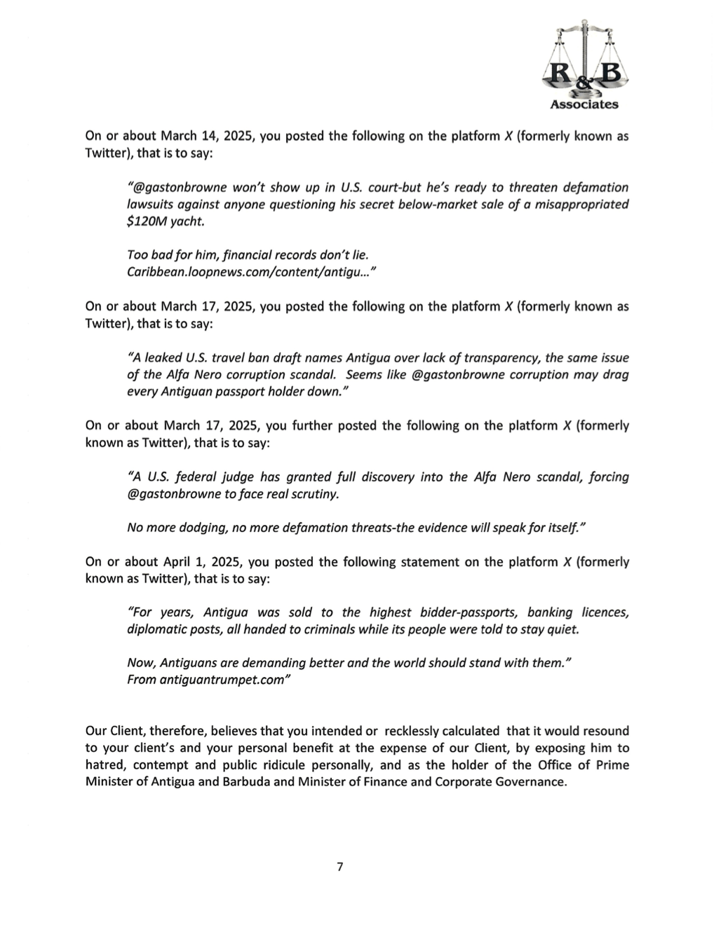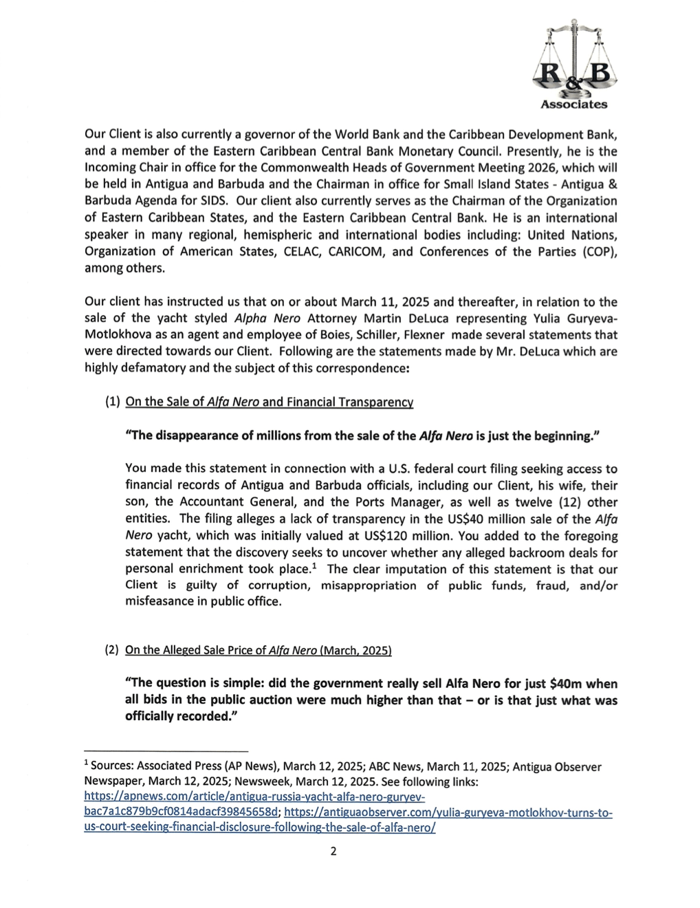 Prime Minister Gaston Browne has formally initiated legal proceedings in reaction to new allegations concerning the sale of the luxury superyacht Alfa Nero.