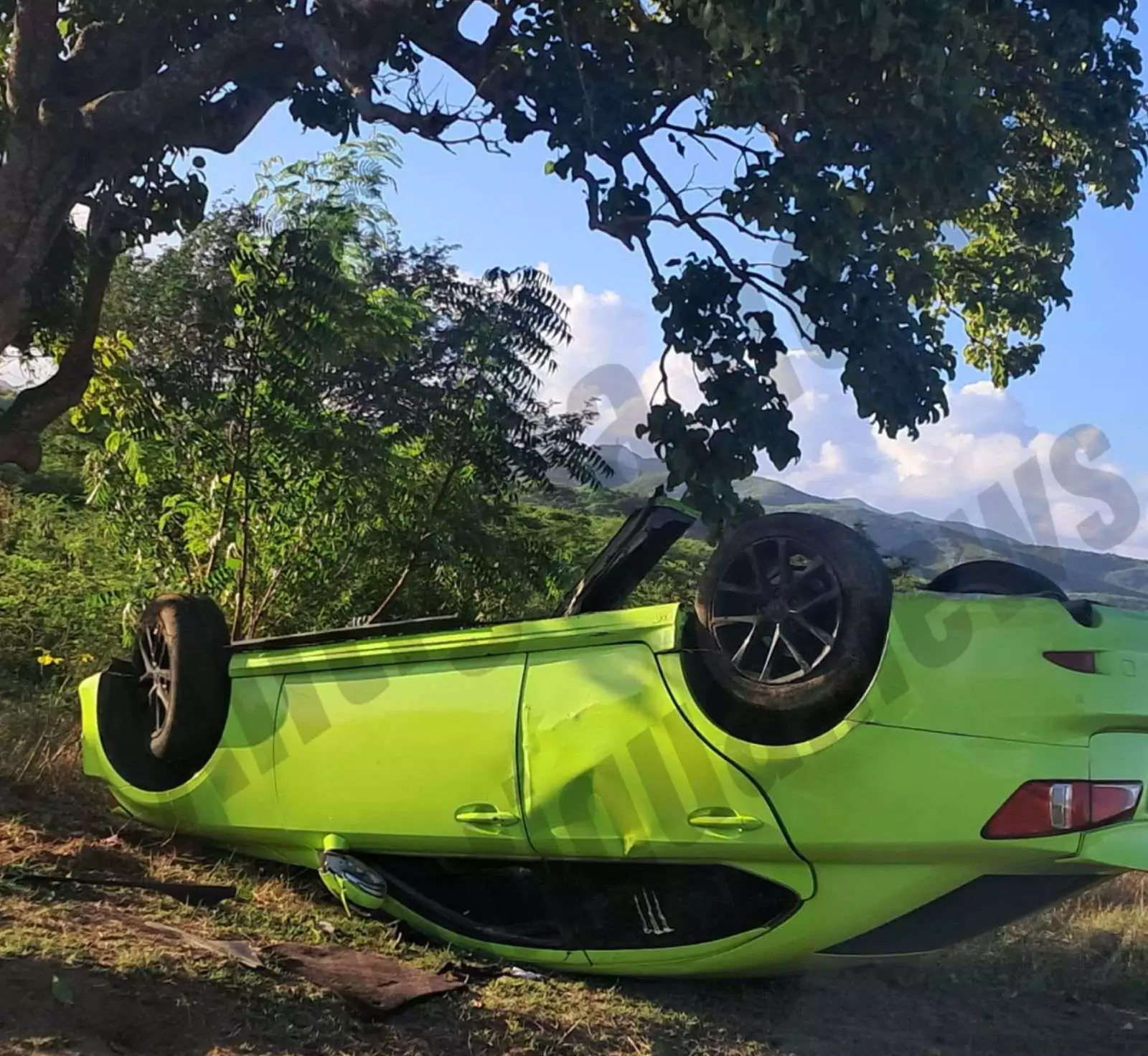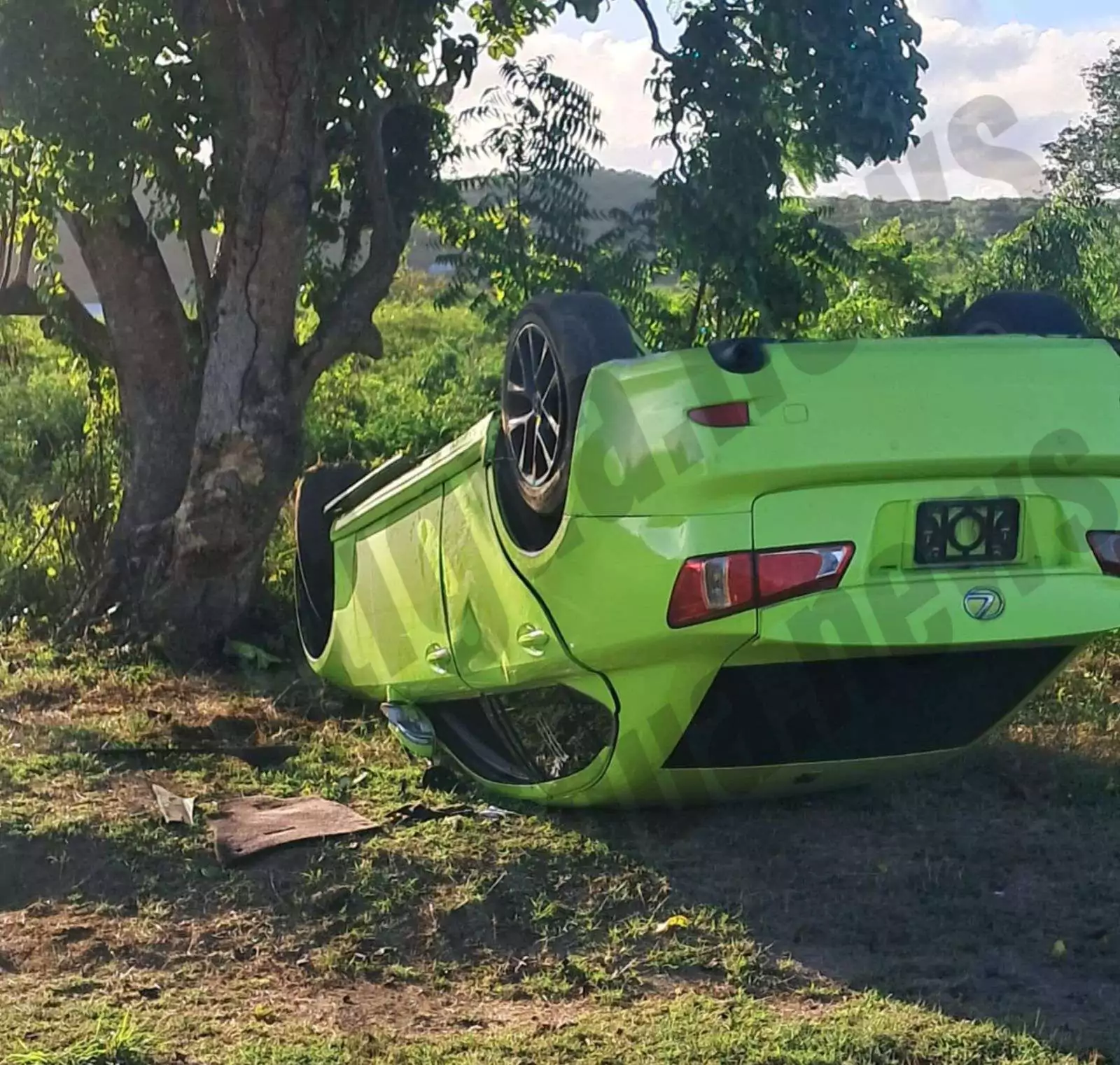 A driver narrowly avoided serious injury early this morning after a lime green Lexus IS overturned along the roadside in Five Islands, leaving the vehicle resting on its roof beneath a tree.