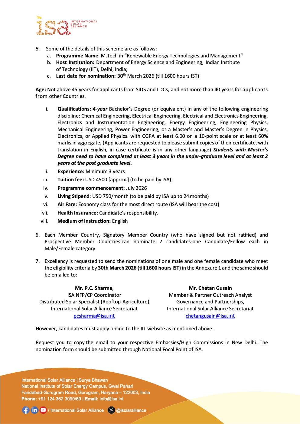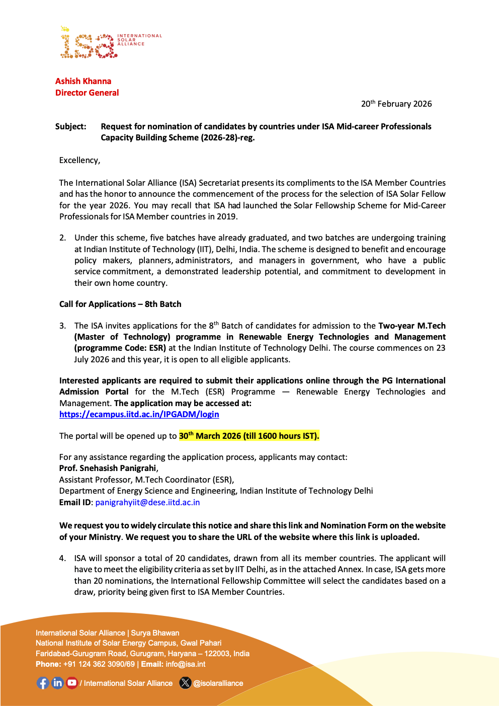 The International Solar Alliance (ISA) has announced the opening of applications for the 2026–2028 Solar Fellowship Programme, offering mid-career professionals from member countries an opportunity to pursue advanced studies in renewable energy.