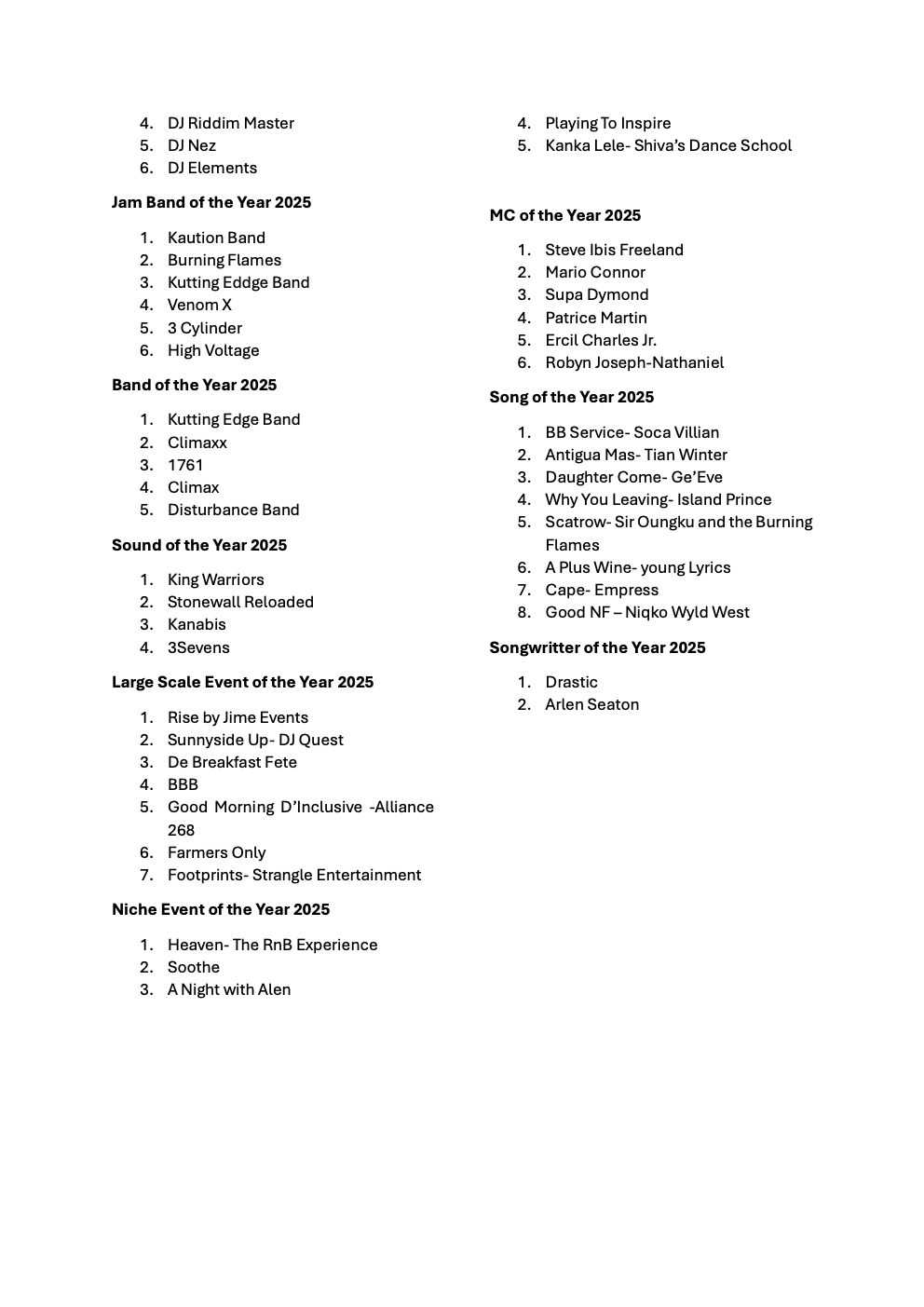 Last evening awards event served as a powerful celebration of the immense talent, creativity, and dedication that continue to shape the soundscape of Antigua and Barbuda. From seasoned musicians and arrangers to emerging artist, cultural ambassadors and contributors to the development of the industry, the 2025 honourees represent the very best of the island’s musical excellence, we are proud of your contributions.
