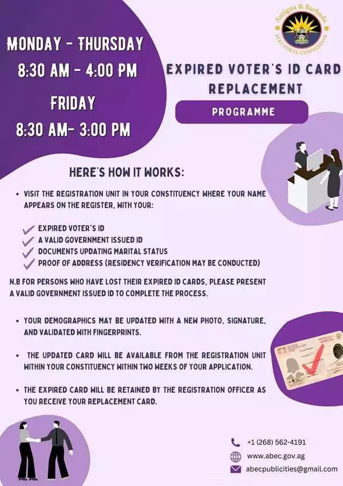 The Antigua and Barbuda Electoral Commission (ABEC) has announced a structured programme to facilitate the replacement of expired voter’s identification cards, as the country prepares for upcoming electoral activities.