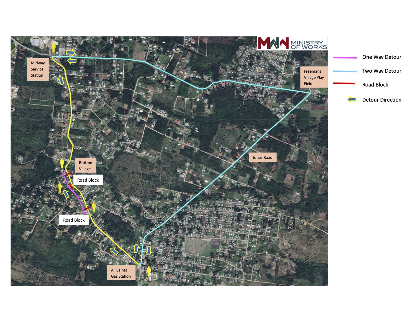 Motorists approaching Midway Service Station in the direction of All Saints, with a final destination beyond the infrastructure work site, will be directed to proceed along Freeman’s Village main road.